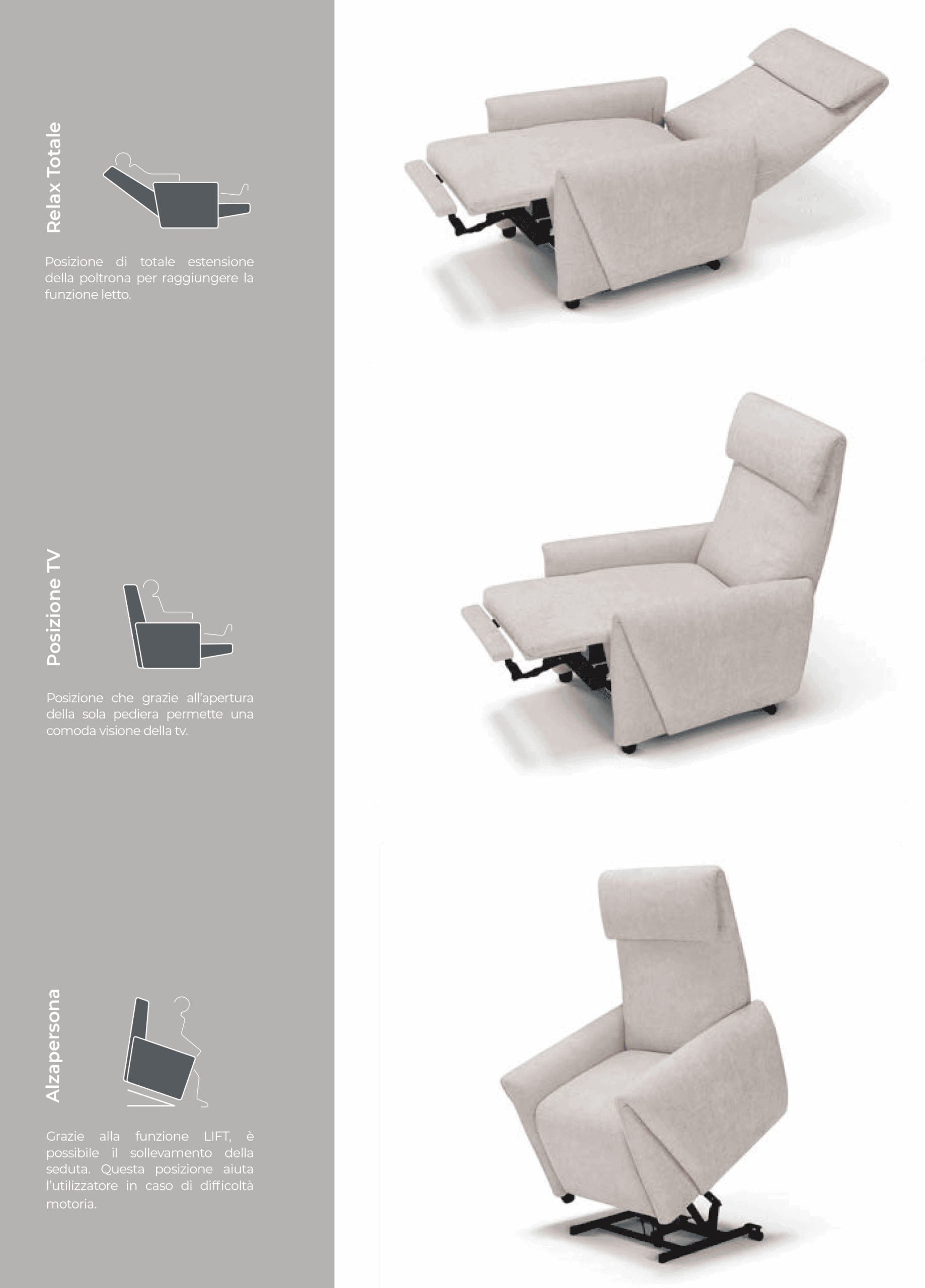 L’originale e innovativo design rende questa poltrona lift-relax adatta e protagonista in ogni ambiente della casa. La seduta è comoda e confortevole grazie anche all’alta spalliera con imbottitura poggiatesta.